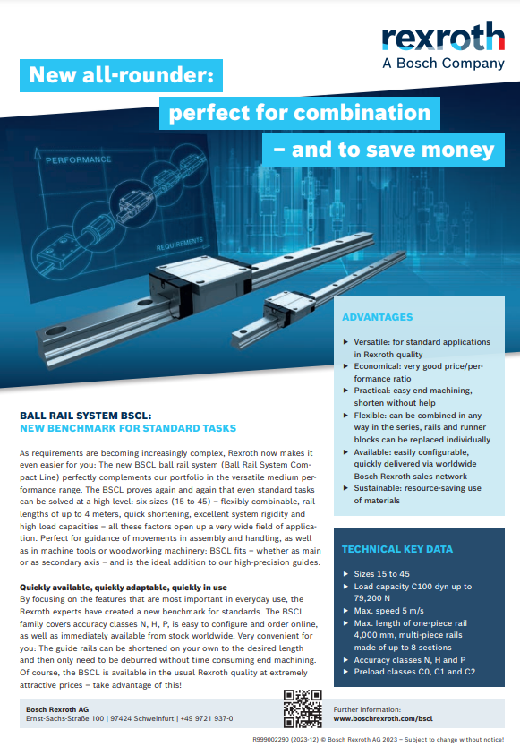 REXROTH LINEAR GUIDE systems are available in BSL, BSHP, and BSCL series, offering high rigidity, low friction, and smooth linear travel. These guides feature recirculating ball bearings, hardened raceways, and compact carriage blocks. Ideal for CNC MACHINING CENTERS, LASER CUTTING MACHINES, 3D PRINTERS, and PRECISION ASSEMBLY LINES, they support both horizontal and vertical axis configurations.